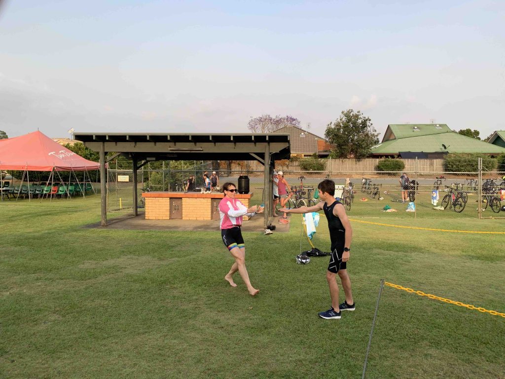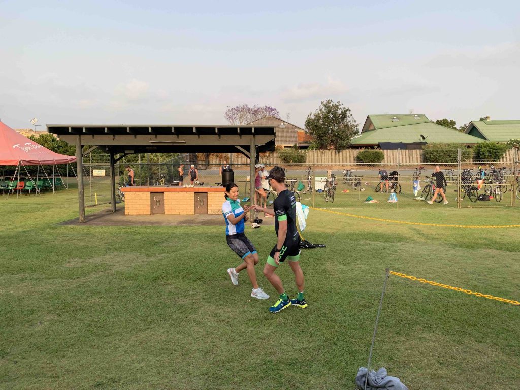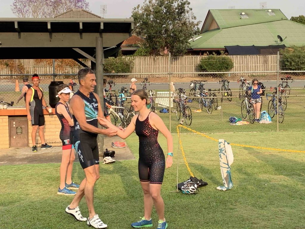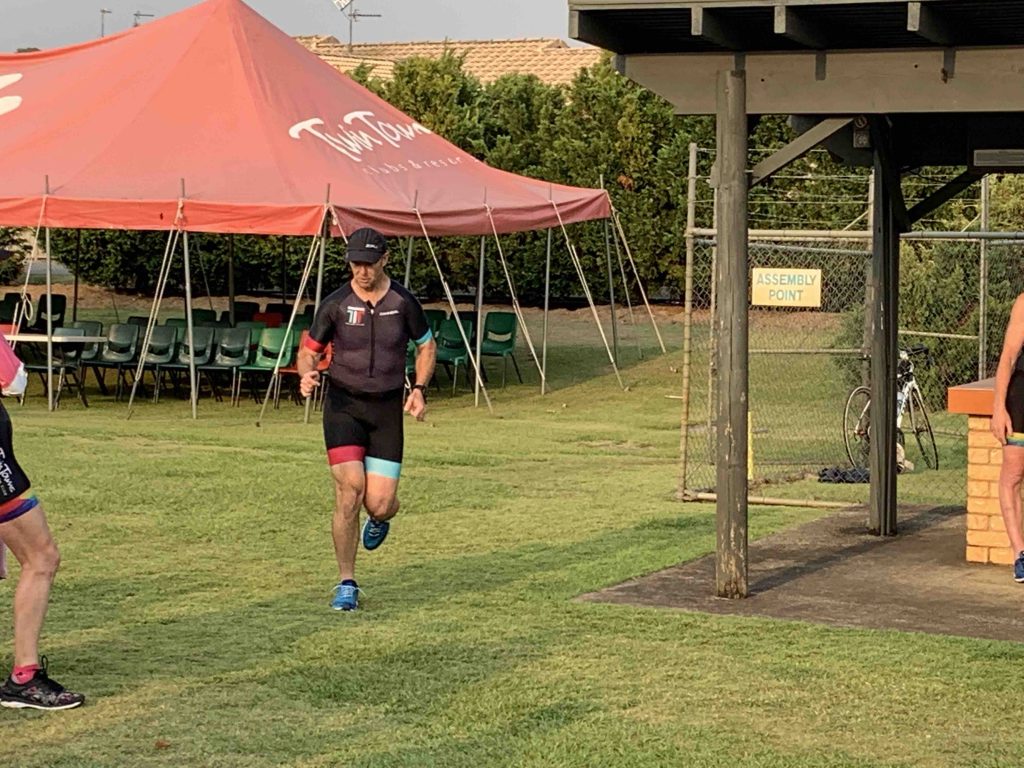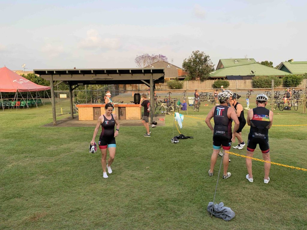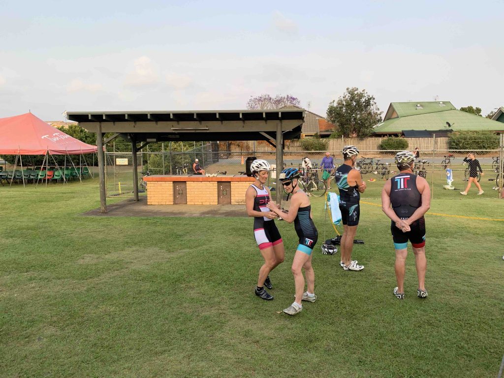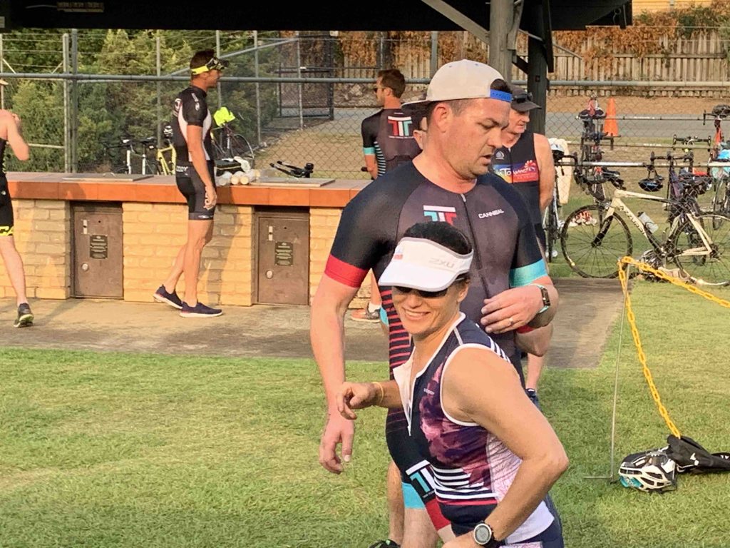 Under cool, smokey skies the Twinnies gang competed in our first ever Super Teams Event. With each team comprising of a range of abilities Kev, Dave and Stu calculated handicap times and a not long after 6 am, the first swimmers were in the pool. Swimmers completed 5, 5 and 4 laps respectively, followed by cyclists all completing 1 lap of Darlington. Lastly the first runner completed 1 lap of the Intermediate course, followed by the next two runners completing 2 laps along the golf course to the machinery shed and back. There were some exciting handovers of the very important rubber band and also a few questionable ones?! I think everyone will agree that it was a lot of fun and a great success. Thank you Kevie for all the effort you put in organising the event and of course to Dave, Stu and the other members of the Committee who all helped out to make the event a success.
